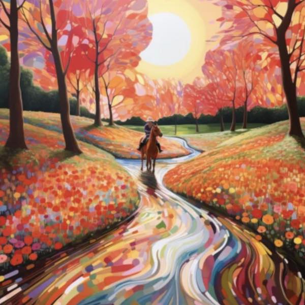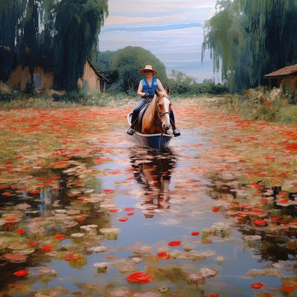 Midjourney c’est quoi ? C’est une intelligence artificielle qui crée des visuels. Alors je me suis amusée, sur le thème des balades à cheval, à voir quelles images pouvaient en ressortir. Et vous allez voir, les résultats sont bluffants et je crois qu’ils vont vous plaire.